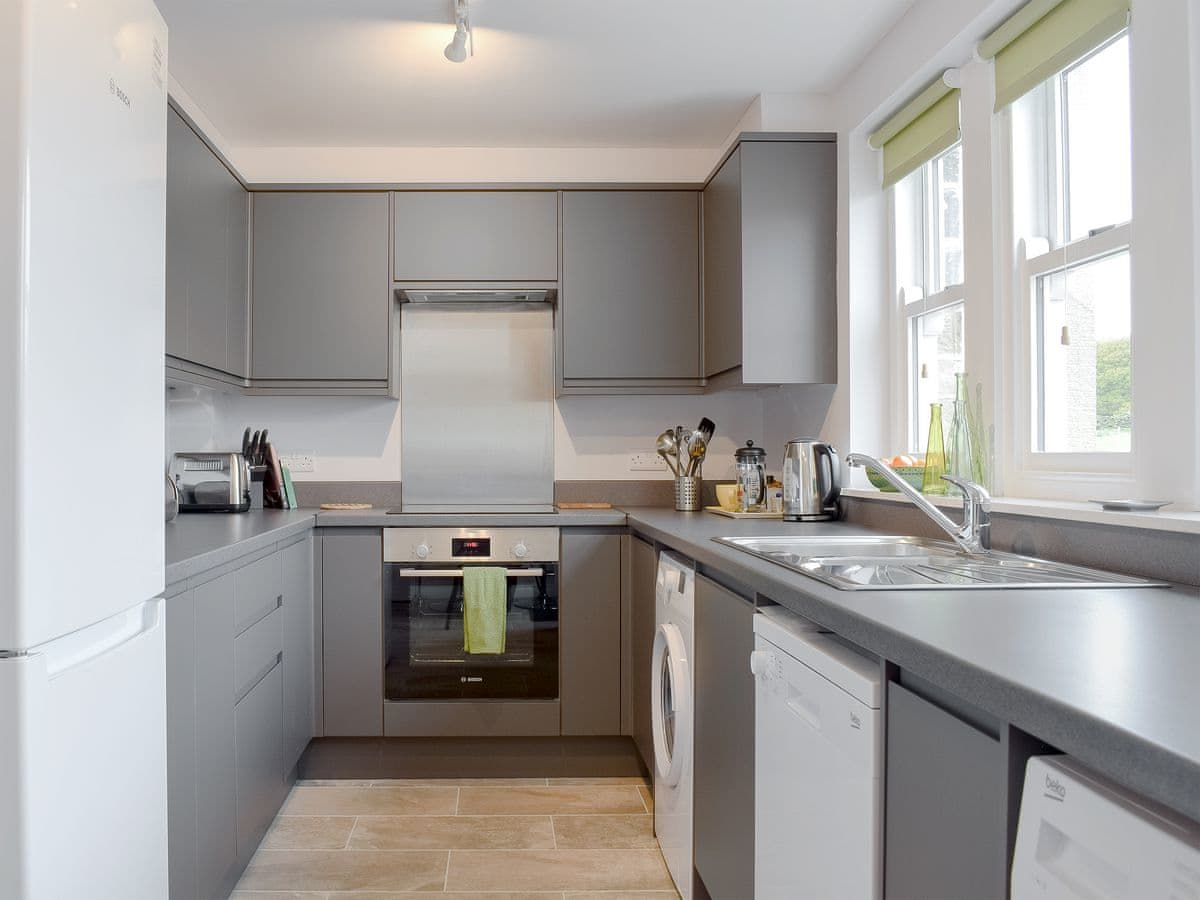 Kitchen: Galley style with breakfast bar, electric cooker, microwave, fridge/freezer, dishwasher, washing machine, tumble dryer, beams and tiled floor.